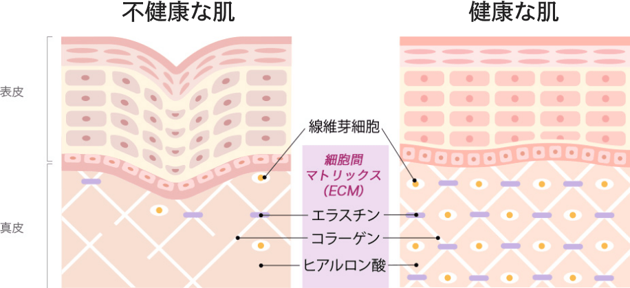 まず「肌再構築」とはどのように起こるのか?ということですが「肌再構築」を理解するためには「細胞間マトリックス(ECM)」を理解する必要があります。ECMとは、肌の中のコラーゲン、エラスチン、ヒアルロン酸をはじめとする、細胞と細胞の間を満たしている組織を支える物質の総称です。ECMは近年、細胞の増殖・分化・形態を維持するための重要な役割があると判明しつつあります。