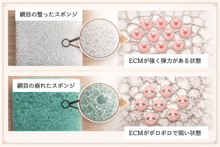年齢を重ねると紫外線などの外的刺激により、ECMがダメージを受け続け、コラーゲンやエラスチンが減少し(ECMが劣化)結果的に皮膚を支える力が弱まり、たるみやシワが生じるという仕組みなのです。