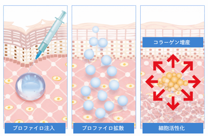 プロファイロを注入すると、ECMが再構築され、細胞の活動が活性化し、コラーゲン・エラスチンの産生が促進されます。その結果、皮膚の中のコラーゲン・エラスチンの密度が高くなり、自然なハリが出る、皮膚が引き締まってリフトアップするなど肌全体が若返ります。