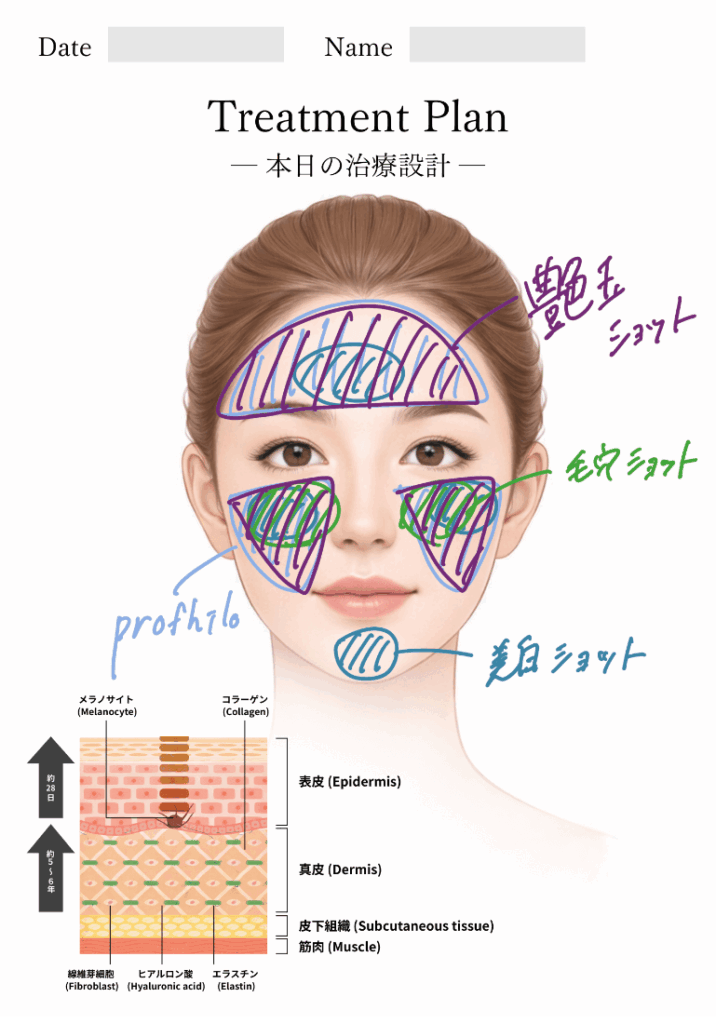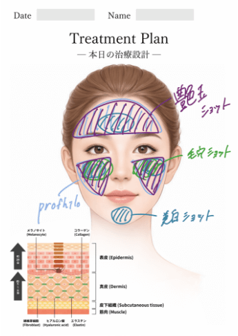 洗顔後、医師とのカウンセリングを行います。「現在の肌状態」「お悩みの原因」「治療の選択肢」を確認しながら、 超極上 肌質改善注射治療設計図、年間スケジュール、ホームケア一覧を一緒に作成します。効果・ダウンタイム・リスクについても丁寧にご説明します。